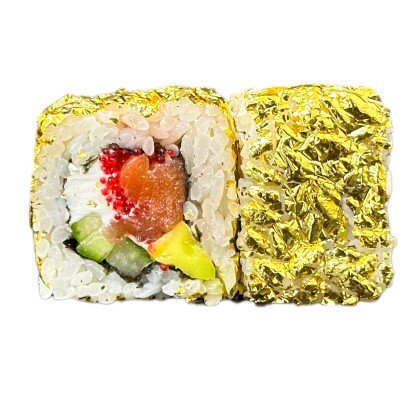 Креветка королевская, сыр сливочный, дайкон, чука, золото пищевое, нори, рис