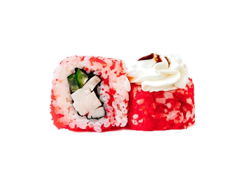 Куриный рулет, огурец, крем-чиз шапка, масаго, терияки соус, нори, рис