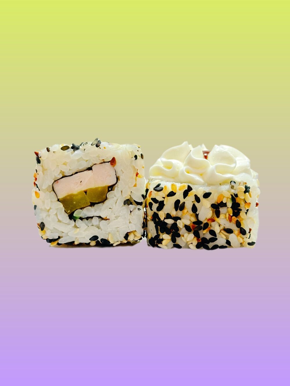 Рулет куриный, дайкон, кунжут, крем-чиз шапка,, терияки соус, нори, рис