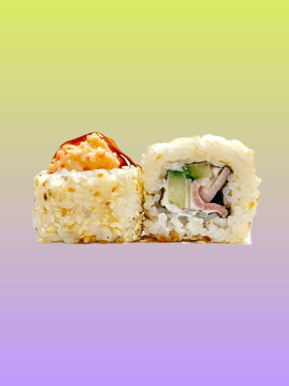 Бекон, огурец, крем-чиз соус, снежный краб (имит.), икра масаго, терияки соус, кунжут, нори, рис