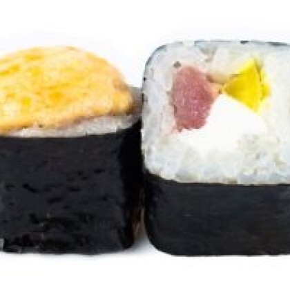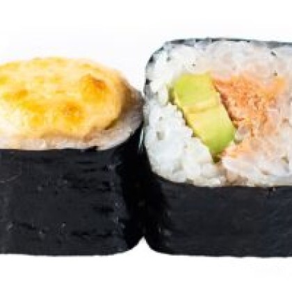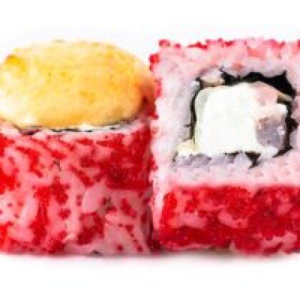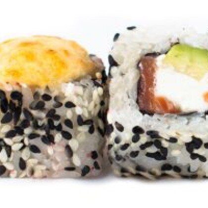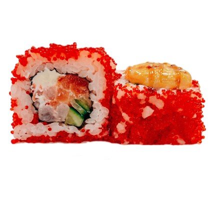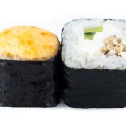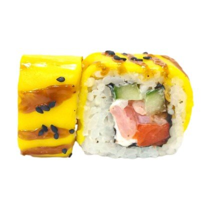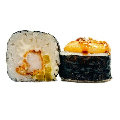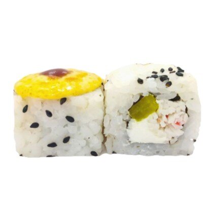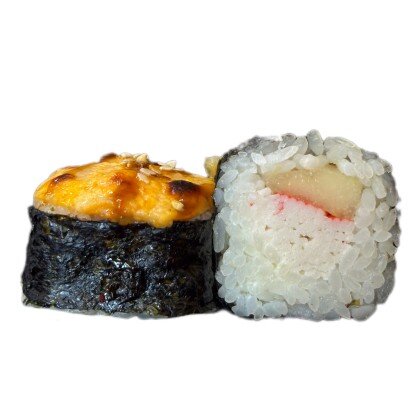 Нори, рис, куриный рулет, перец, фирменная сырная шапочка и соус чили