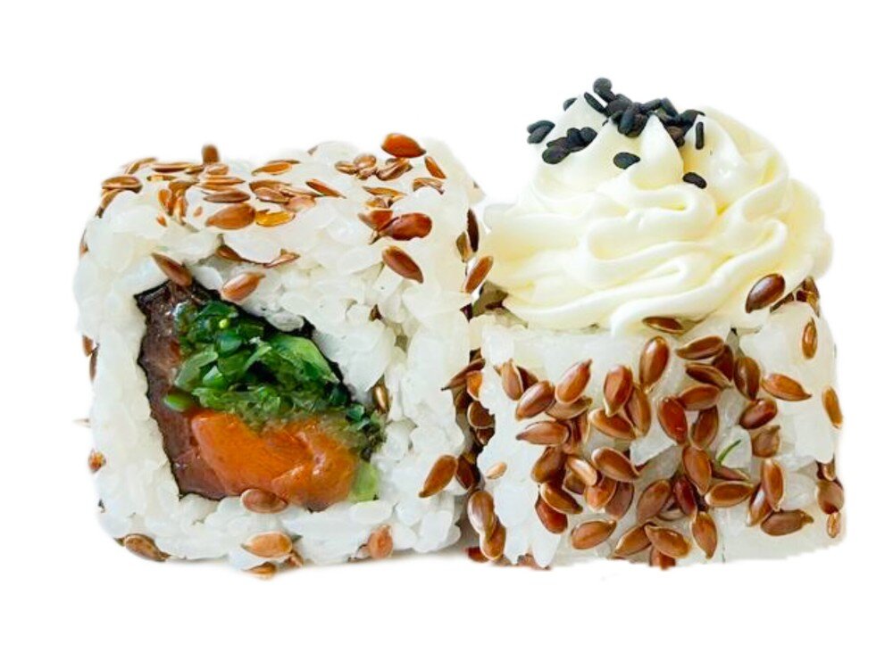 лосось, чука, лён, кунжут, крем-чиз шапка, нори, рис