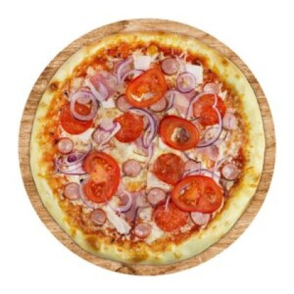 Соус барбекю, сыр, бекон, колбаса пеперони, шампиньоны, маслины.