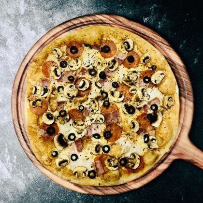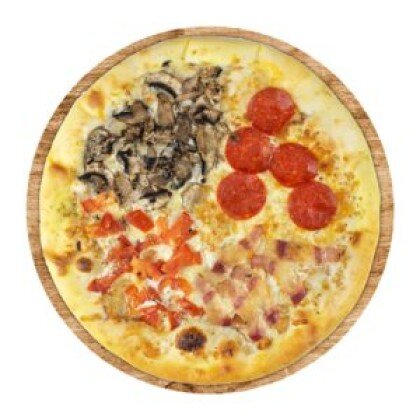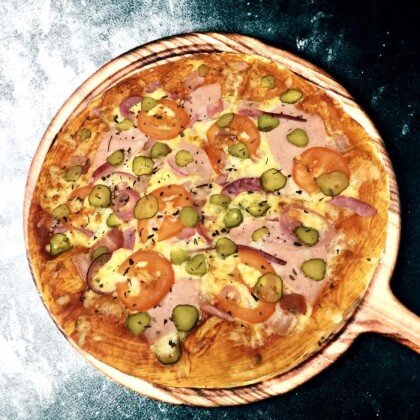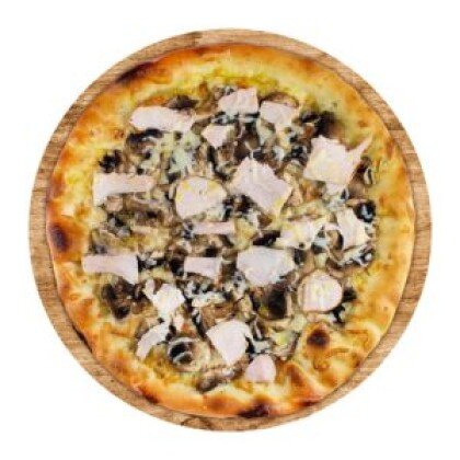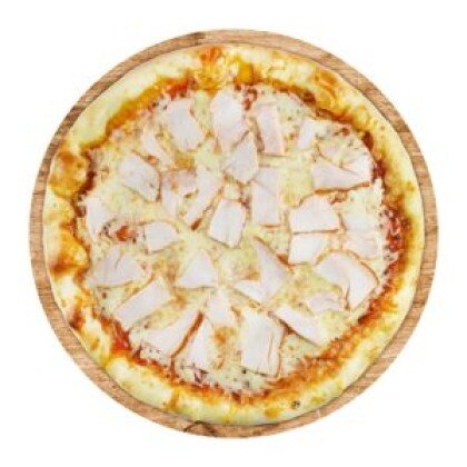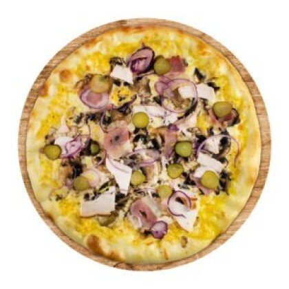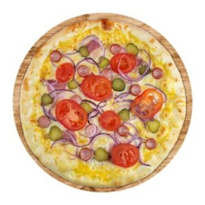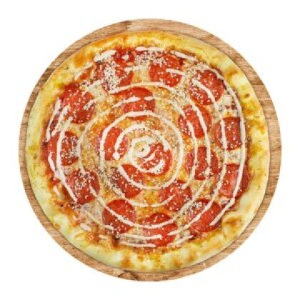 Соус томатный, сыр, куриный рулет, копчёная грудинка, колбаса пеперони, лук, томаты, кунжут белый.
